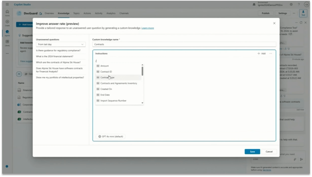 Copilot Studio is making progress on the Knowledge management as well. Now it supports SharePoint Lists, as well as uploading files grouping them together as a single knowledge base. Plus, now you have the option to write Instructions at knowledge level.